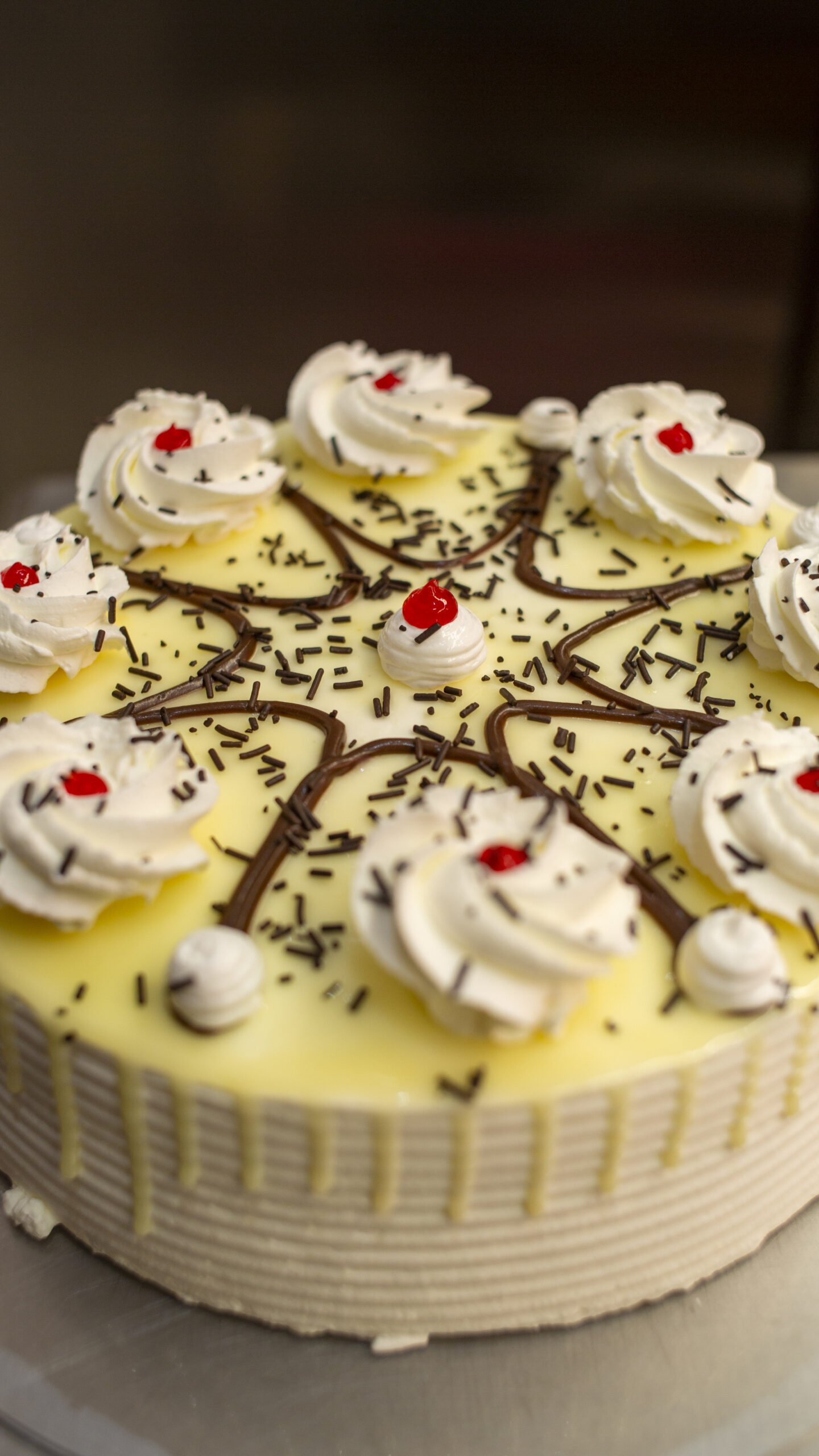 Tarta rellena de una jalea extremadamente refrescante que se combina con el perfecto sabor de la crema Chantilly y el bizcocho de vainilla cubierta con un glaseado de ganache de chocolate blanco.
